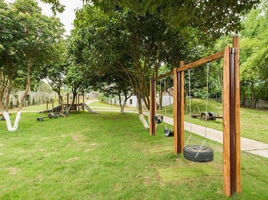 khu vui chơi trẻ em thiết kế riêng với vật liệu tự nhiên gồm bập bênh gia đình, xích đu, cầu trượt, zipline, vòng đua xe đạp thăng bằng quanh vườn cây xanh